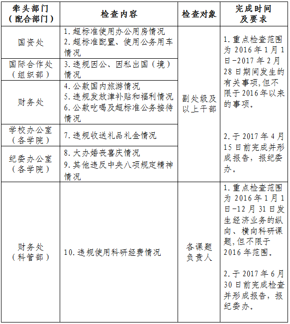 根据中央第十五巡视组的要求,按照学校党委工作安排,经2017年3月20日学校党委常委会审议通过,现对我校贯彻落实中央八项规定精神和科研经费使用情况开展专项监督检查,具体事项通知如下: